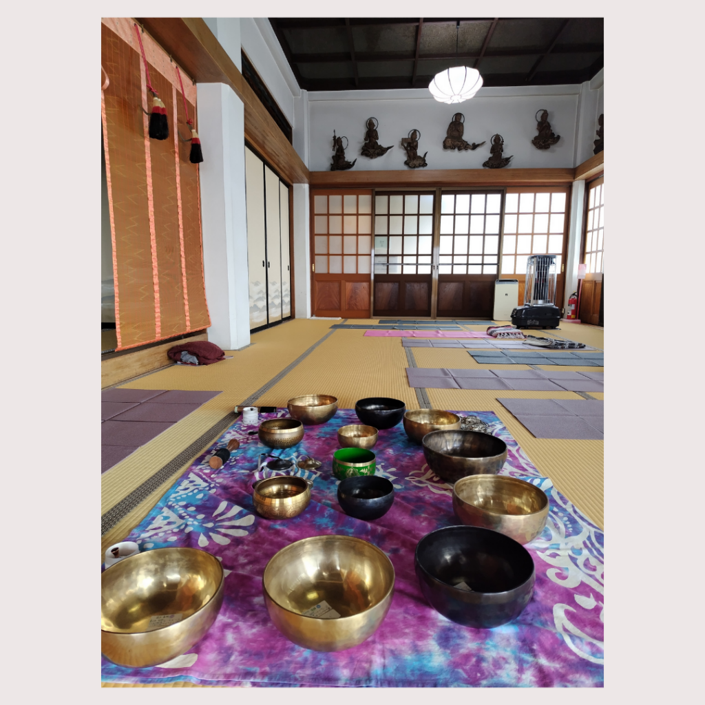 お寺の本堂という特別な空間で、ポーズの間はシンギングボウルの音が体に響きます。