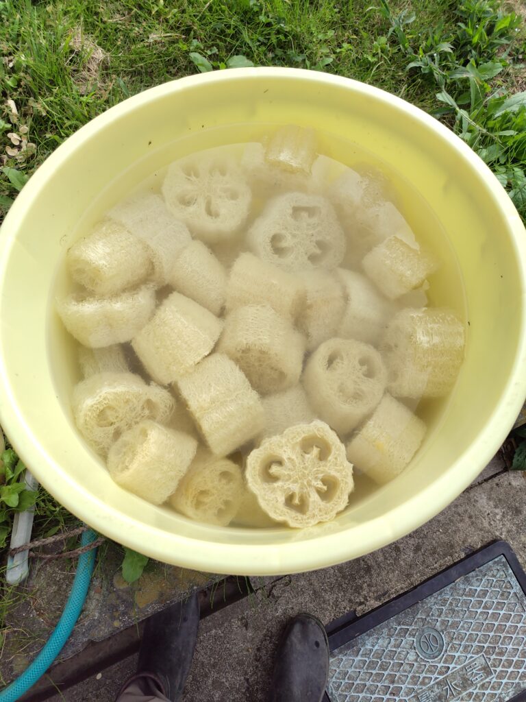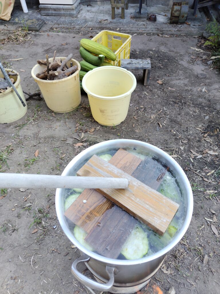 自然の力を借りながら、ゆっくりと時間をかけてへちまを煮ると、皮がやわらかくなり、きれいに中身を取り除くことができます。