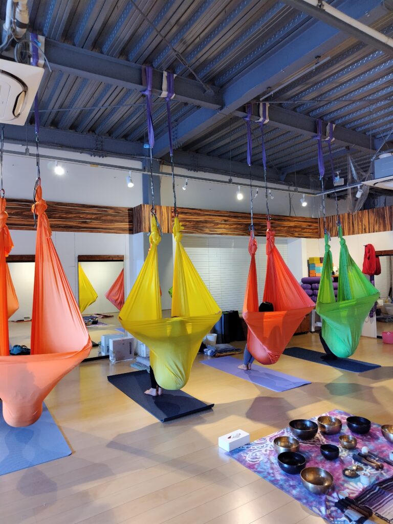 月に一度のリラックスを目的にした「シンギングボウル&低空エアリアルヨガ」を開催しました。