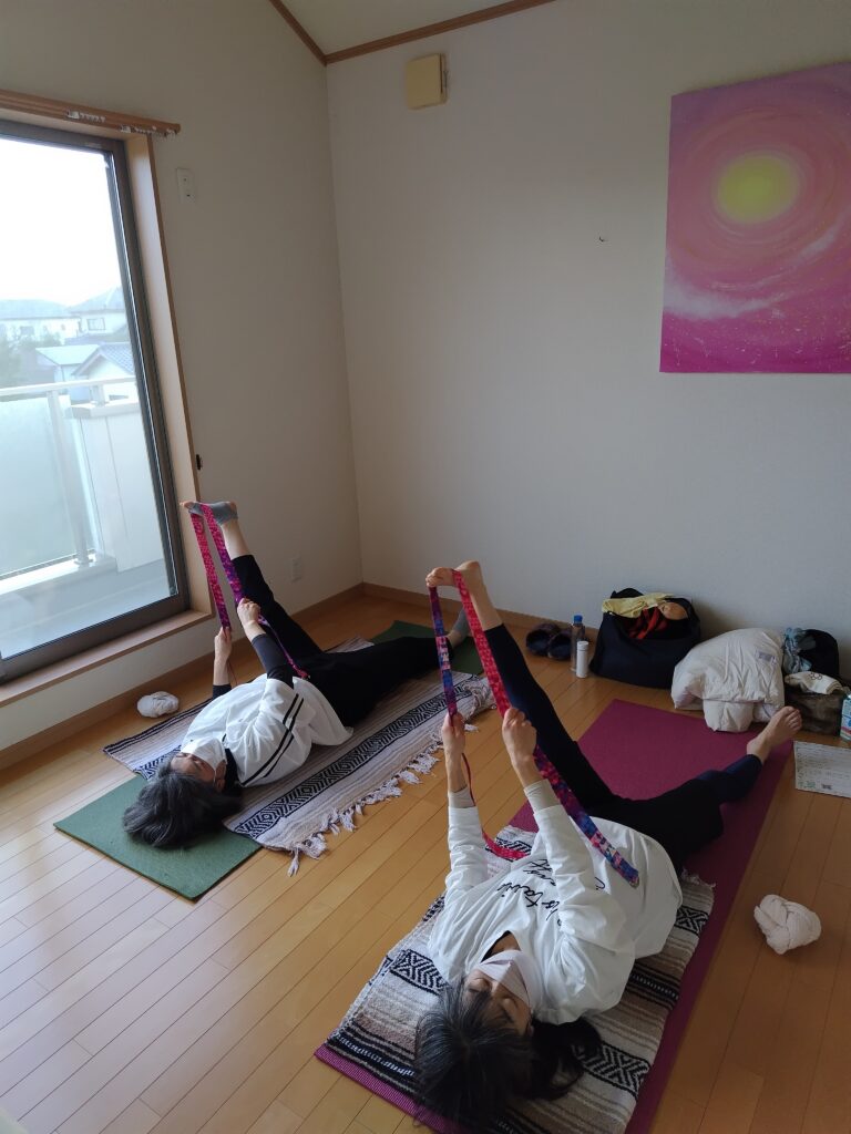 はじめはヨガベルトを使い、股関節まわりをやさしくほぐすところからスタート。