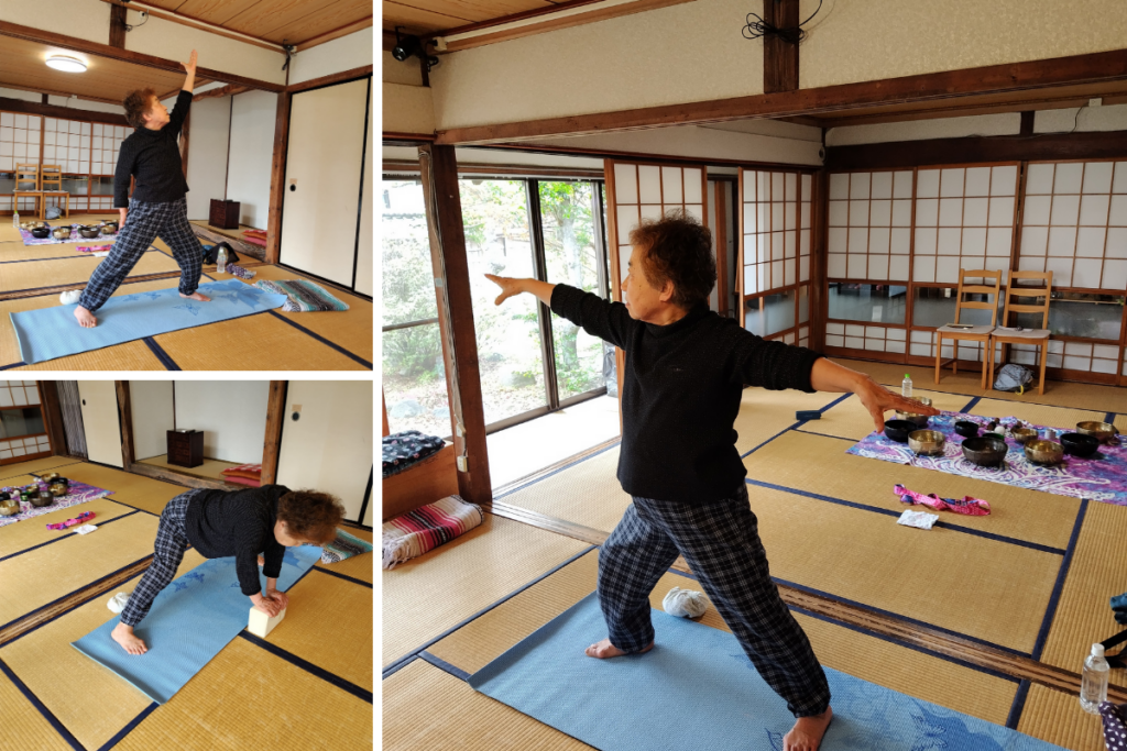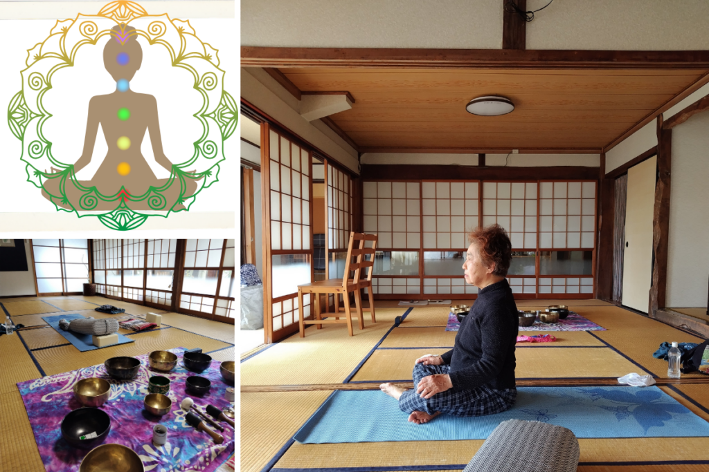 古民家カフェでのヨガとシンギングボウル倍音浴クラスの様子