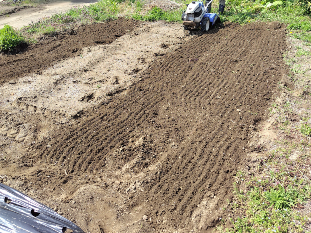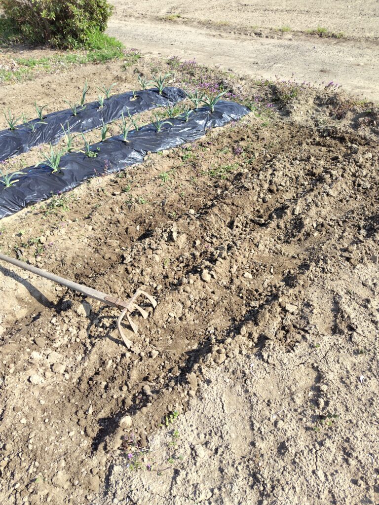 5月にはサツマイモを植える場所。土を耕して柔らかくしておきます。