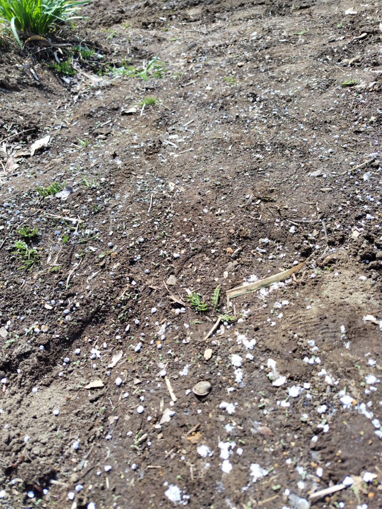 ブロッコリーの小さくやわらかな苗にとっては、少し厳しい春の雨風です。